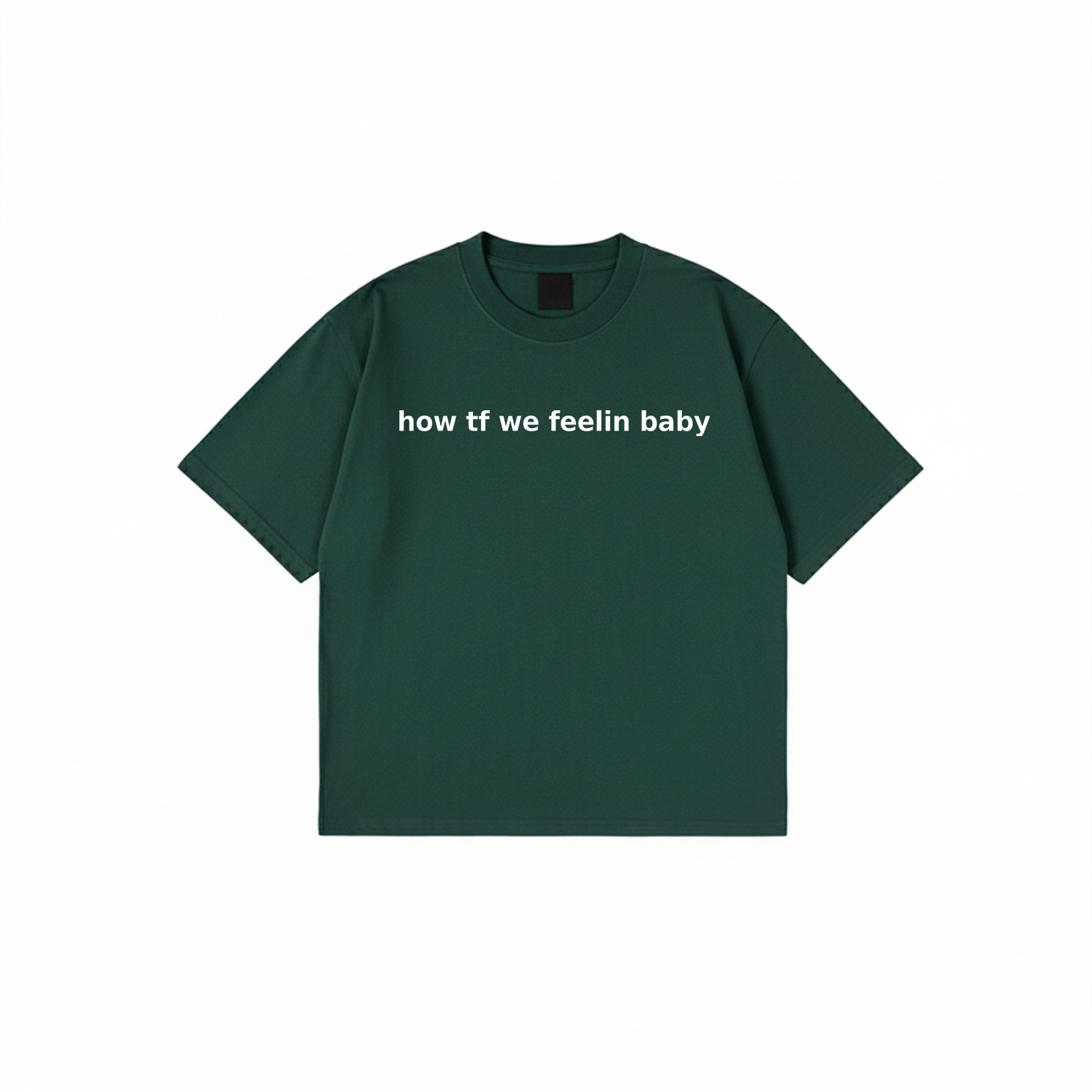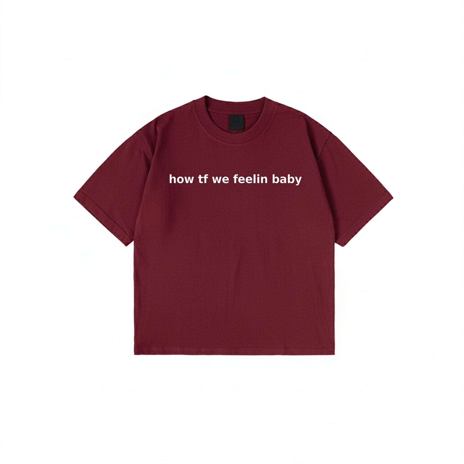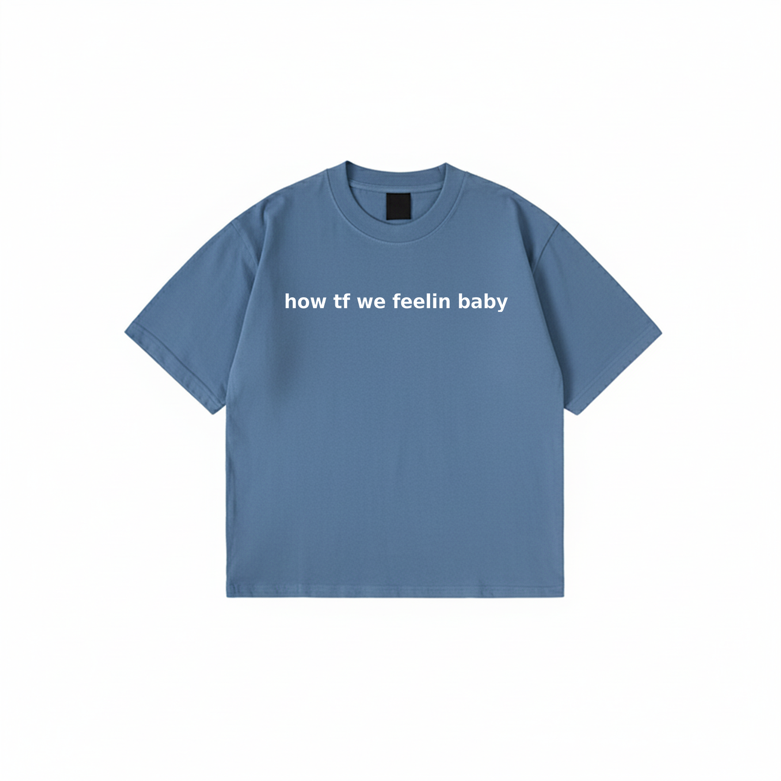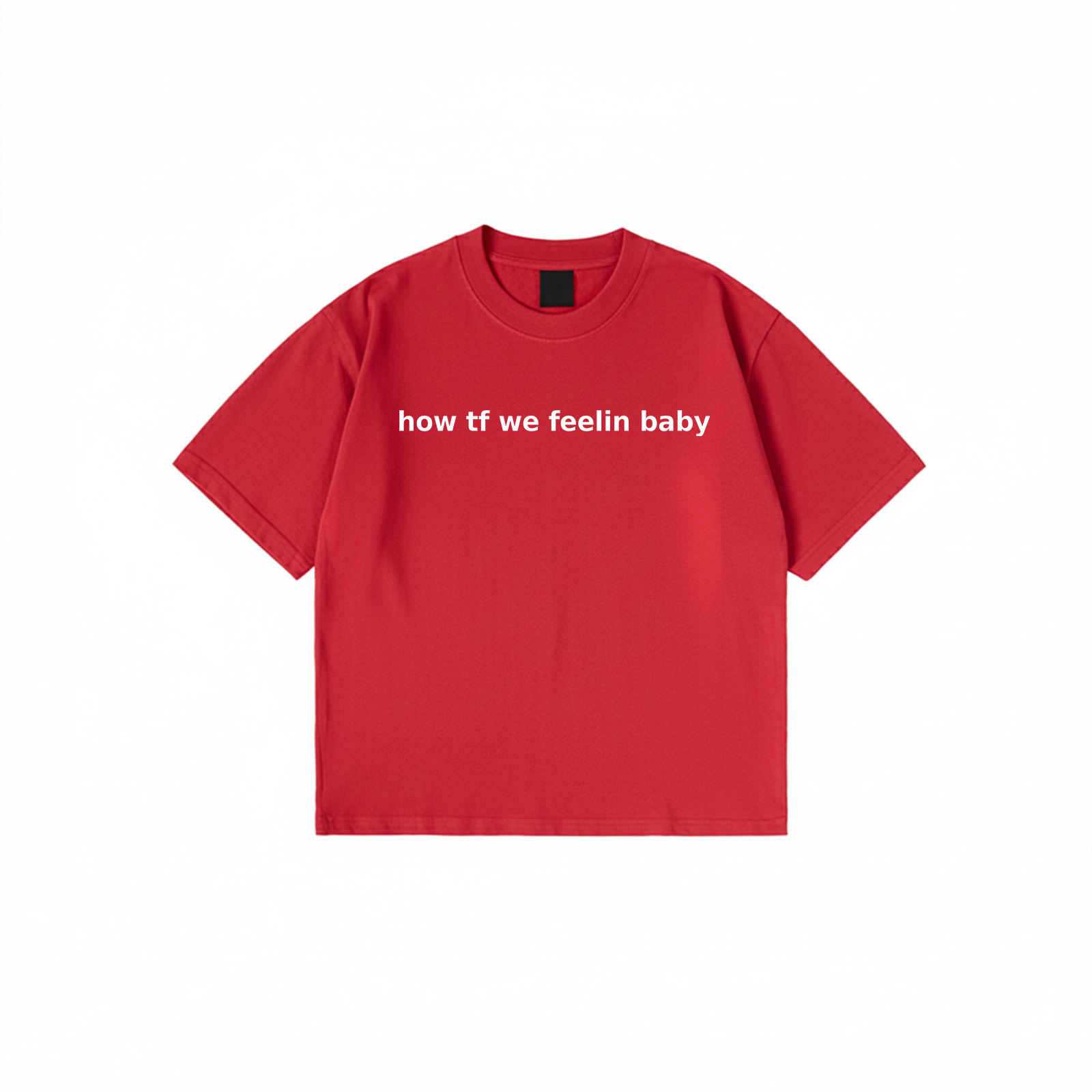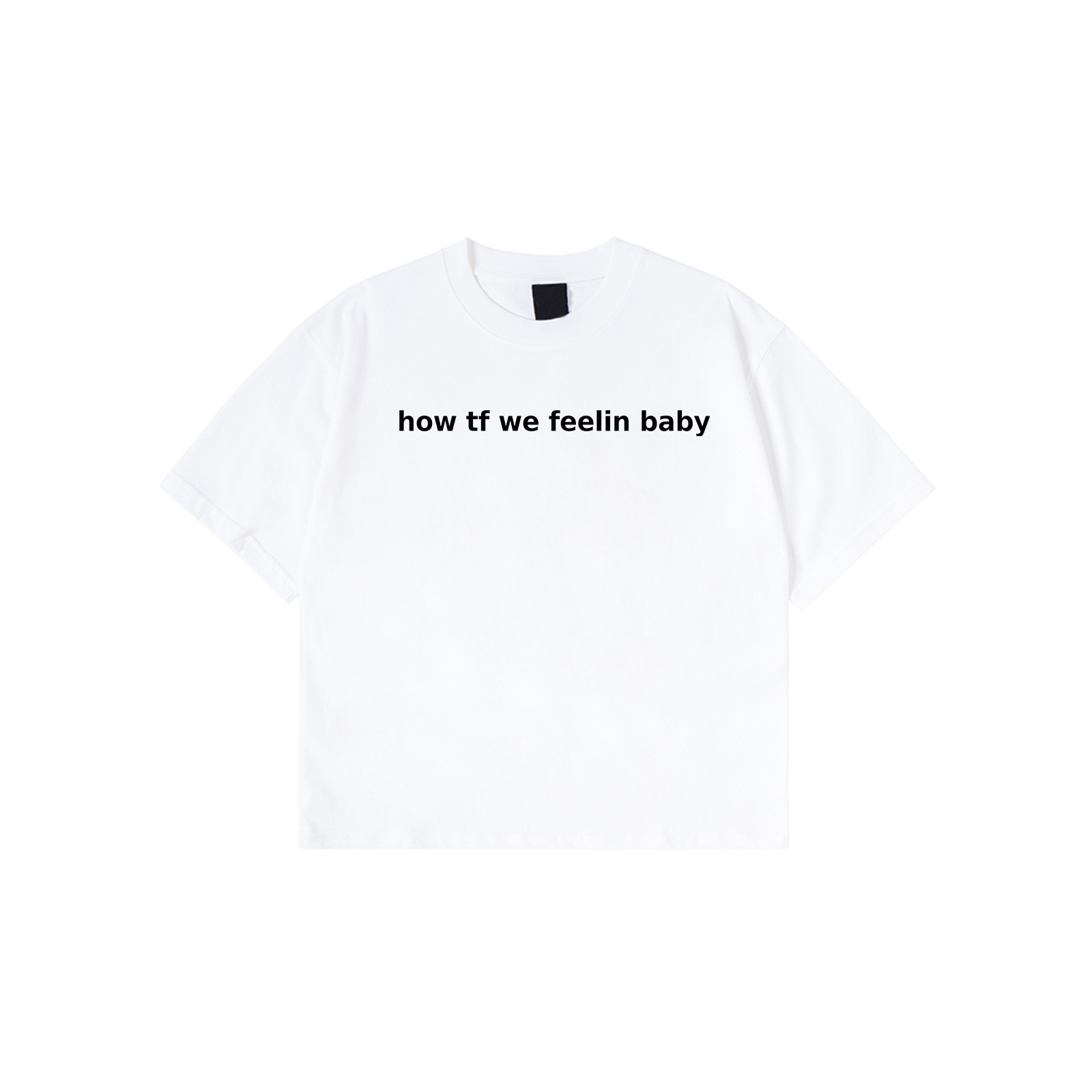 Make a bold statement with the Graphic Text T-Shirt — featuring the viral phrase “how tf we feelin baby” printed in clean white font across the chest. This tee perfectly captures the laid-back, confident energy of modern streetwear. Designed for those who like to express themselves with attitude and humor, it’s your go-to everyday shirt for effortless style.